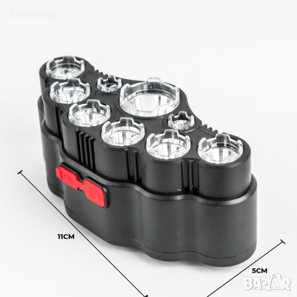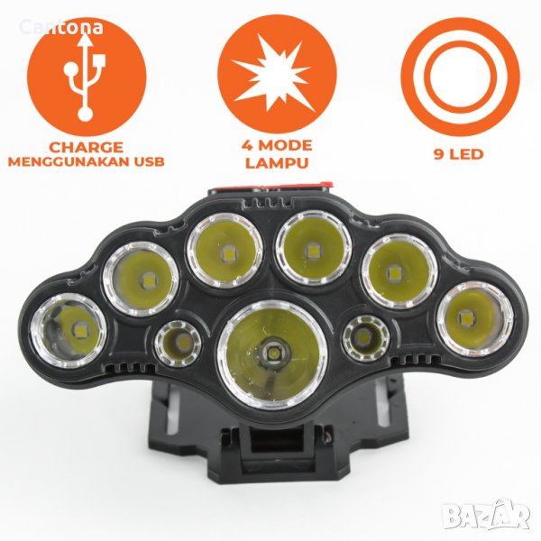 Мощен челник за глава с 9 LED диода, 4 режима на светене, USB зареждане