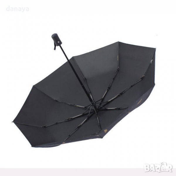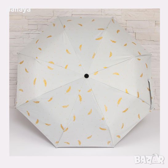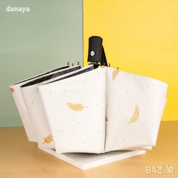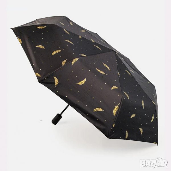 чадър за дъжд, чудесно решение, когато искаш да имаш чадър в чантата си по всяко време. Стилен дизайн, с принт на златисти пера. Предлага се в два цвята – черен и светло бежов.