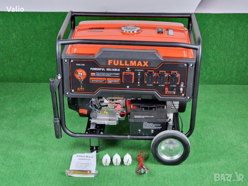 Новите 6.5 KW бензинови четиритактови генератори FULLMAX, за монофазен ток. ВГРАДЕНО АВТОМАТИЧНО ЗАРЯДНО ЗА АКУМУЛАТОРА. При нашите генератори автоматичното старт-стоп табло следи за нивото на заряд на акумулатора и при нужда го дозарежда до нужния заряд, за да може всеки път генератора да стартира безупречно. Когато генератора не е превключен на режим автоматика, паленето на генератора е с ключ, който е на управляващото табло. Генераторите са с медни ротори и статори. Бензинов Двигател VТR 800 с въздушно охлаждане, 16 конски сили. Работна честота: 50 Hz. Вграден AVR /Automatic Voltage Regullator/. Автоматичен предпазител против претоварване на генератора. Магнетен стартер и автостартер с ключ и акумулатор. Транспортна рамка с колела и дръжки за по-лесно предвижване на генератора. Генератора има вграден дигитален дисплей показващ изходящият моментен волтаж, херцовете и отработените моточасове. 3 броя изходи за 230 V и един изход за 12 V. Нивото на шума е 69-72 dB. Разход: 450 грама бензин на киловат час при пълно натоварване. Размерите му са: дължина 68 см., ширина 51 см. и височина 55 см. Тегло бруто с автоматиката 110 кг. Гаранционен и след гаранционен сервиз.