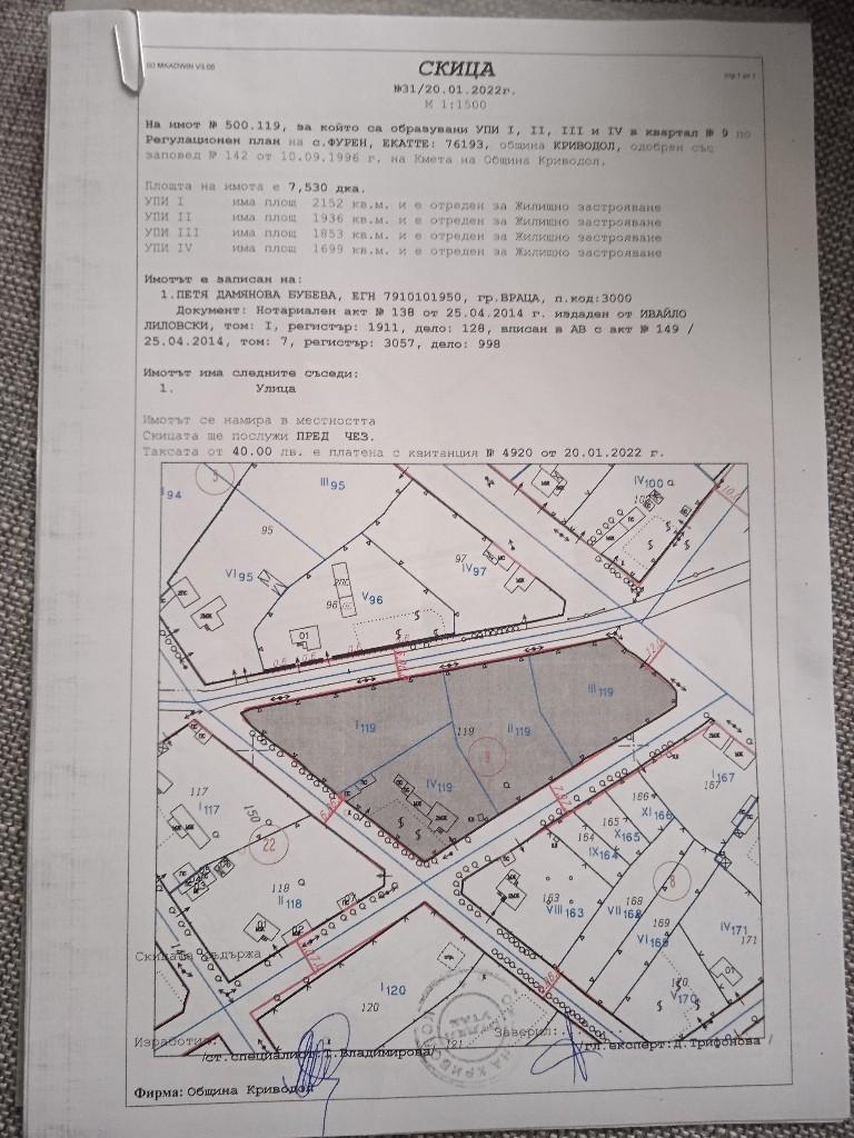 Представям Ви имот, подходящ за фотоволтаична централа, който представлява четири съседни поземлени имоти (обединени с ограда в един общ парцел) в с. Фурен, общ. Криводол, обл. Враца. Парцелите са в регулация, с обща площ 7,5 дка и граничат с четири улици, едната от които АСФАЛТОВ ПЪТ ( най дългата част на имота). Районът е с изградена инфраструктура, с водопровод и електрификация. В имота има налични партиди за ток и вода. Теренът е ограден и много плодороден. В единия парцел има стара едноетажна къща, която е за ремонт и се състои от коридор, 4 отделни непрехони стаи, голяма тераса и 2 мази. До къщата се намира лятна кухня, която представлява 2 стаи и баня. На скицата се виждат нанесени и няколко селскостопански постройки и сгради за отглеждане на животни. Възможна замяна за апартамент във Враца. За повече информация и огледи 0878922097.