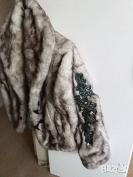 Дрехата е от изкуствена материя, много оригинална, топла. Високата шал яка освен, че е красива,топли също и пази.Виждат се на снимките интересните апликации по ръкавите.Апликациите са от плат. Не мога да определя размера,затова ще измеря каквото Ви интересува.Гръдна обиколка 98-100,рамене 40-42см.