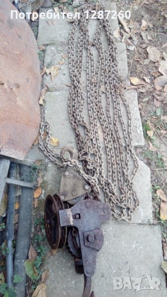 Верижен ръчен телфер мисля, че е 2т. Състоянието се вижда. Едната верига е няма само основната е налична дължина към 8 м.
