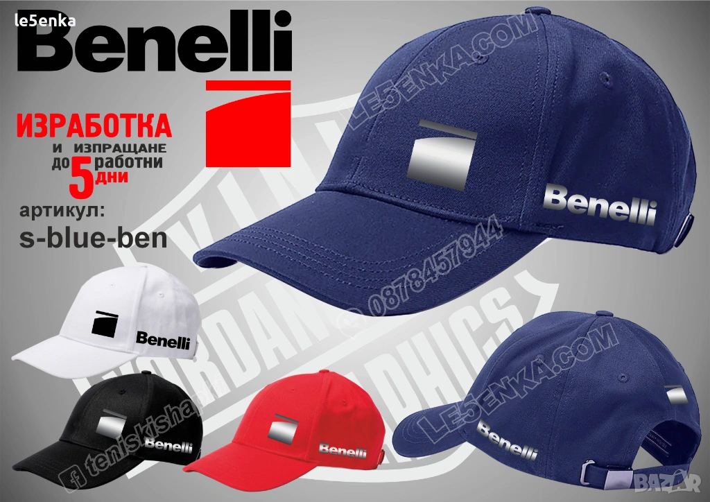 Посочената цена е за шапка и тениска комплект. Само шапка - 18 лв. ,а само тениска - 32 лв. Тениските са изработени от качествена памучна материя - различна номерация и цветове - черен, син, червен и бял. Шапките са памучни с метален клипс или коланче за регулиране - тип бейсболни. Последната снимка в обявата е на таблица с размери за тениските. Изпращаме по Еконт.