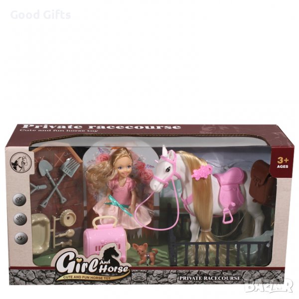 Комплектът включва всичко необходимо за една вълнуваща игра: малка кукла, кон, куче и аксесоари.
