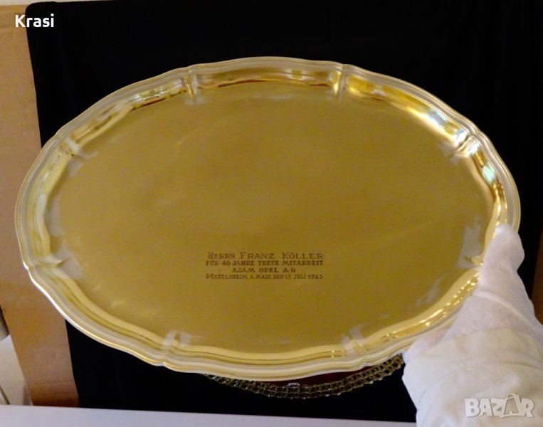 Бронзов поднос на световно известната немска марка WMF,произведен по поръчка на Adam Opel A.G. На подноса има гравиран надпис - Herrn Franz Koller Für 40 Jahre treue mitarbeit Adam Opel A.G. Russelsheim a Main.От него става ясно,че е предназначен за Г-н Франц Кьолер по случай навършването на 40 години лоялна служба в завода на Adam Opel A.G. в град Рюселсхайм на Майн.Подарен на 13 юли 1965 година.Подноса е изключителна находка за любители и колекционери.Височина 2 см.,дължина 37 см.,ширина 27 см.Тегло 570 гр.