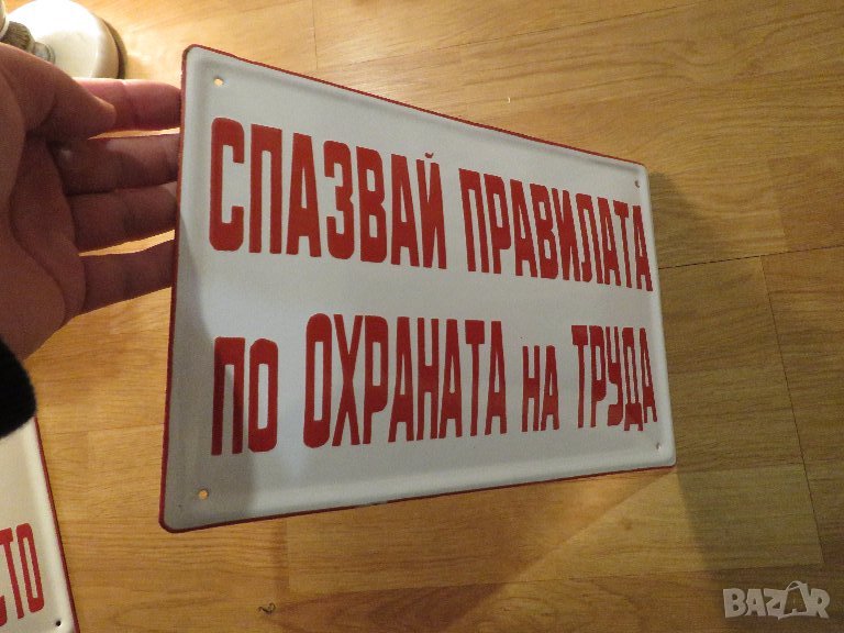Рядка емайлирана предупредителна табела СПАЗВАЙ ПРАВИЛАТА ПО ОХРАНАТА НА ТРУДА - 70те години за тво