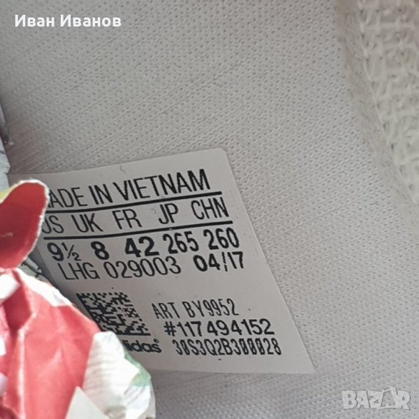 Контрастиращи на белия цвят са фините розови EVA тапи на междинната подметка, които са достатъчно красноречиви, за да заемат своето място върху обувката, без да бъдат заглушени. Завършването на външния вид е детайлът на петата с прословутия текст с три ивици. И накрая, под краката се намира футуристичната междинна подметка Boost, поставена между чистата бяла горна част и контрастираща черна подметка, за да свърже обувката заедно.