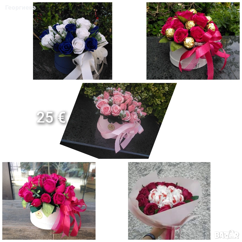 Букети с бонбони и цветя от креп хартия. Изработват се по поръчка. Доставка с Еконт или Спиди.