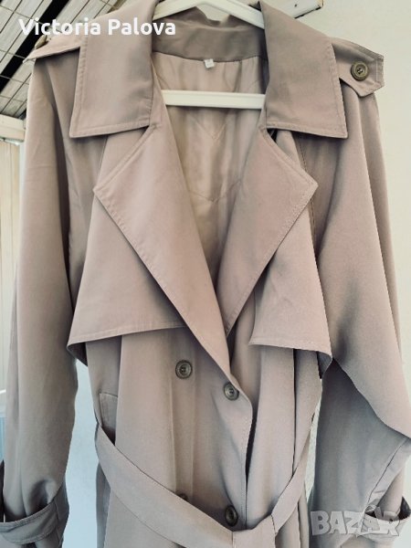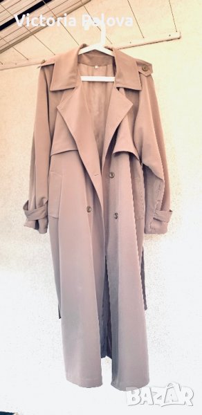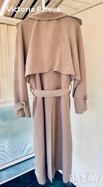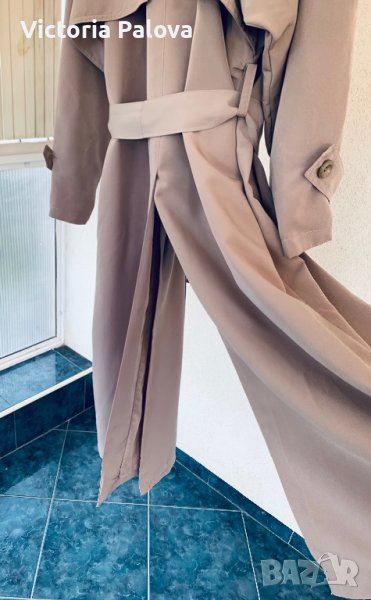 Красив и удобен-лек,като жилетка,материята напомня на тежка коприна-красиво пада надолу и има блясък.ГО-60см,дължина-124см,висок шлиц 61см.цветът е като на първата снимка,кафе с мляко.