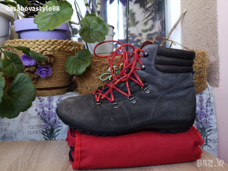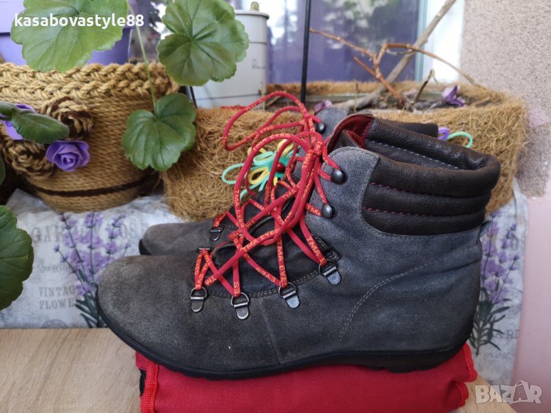 Комфортни дамски боти от реномираната марката Think!! Изработени от естествен велур в сивата гама и елементи от естествена кожа.Моделът е снабден с връзки. Отвътре са изцяло от ест. кожа. Дължина на стелка 26.4см.Височина на ходило в най-задната част 3см.Цялостна височина отзад 16см.