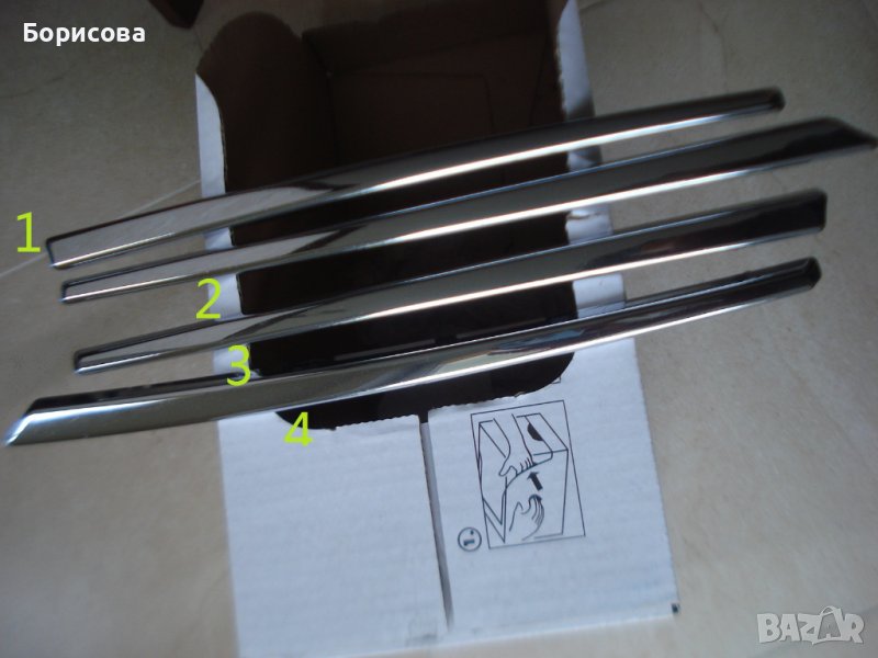 Продавам части от предница за 2014 Инфинити QХ 60 -4 те декоративни хромирани лайсни които влизат в решетко-бронята или тъй наречените "Хромчета". Свалени са много внимателно от 2014 QХ60 и са в отлично състояние- без счупвания или пуквания, нищо не им липсва. Монтажът им е много лесен-влизат в разрезите, и се завинтват с по 2 винта "звезда" от задната част - прилагам и винтчетата заедно с тях - общо 8 на брой . Това са единствените 4 части които имам, нищо друго от тази кола нямам. Оригинални на Нисан са си, снимал съм номера на часта на всяко от тях -мисля че стават за моделите от 2013 до 2015. Искам 27 лева за всяко . Частите са съответно : G 6206 , G 6207 , G 6208 и G 6209 - за да си направите справка, а също так съм снимал и номера на часта на самата решетка (която нямам ) за да сте сигурни. от Овча Купел 2 съм, благодаря ви!