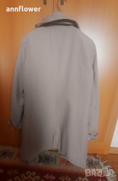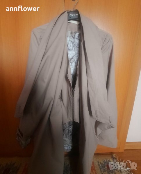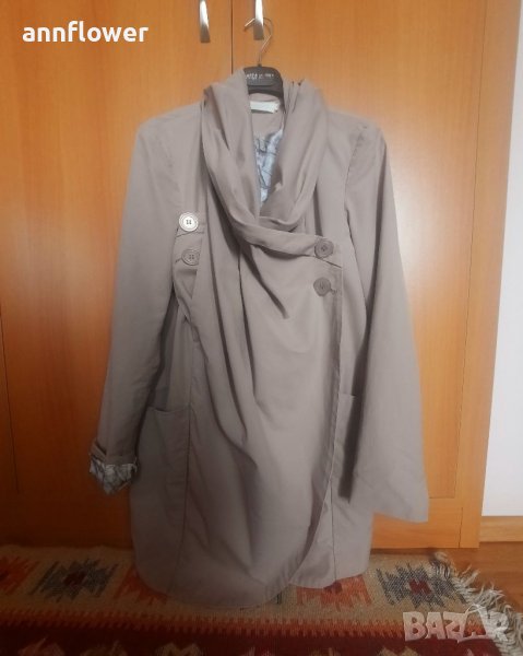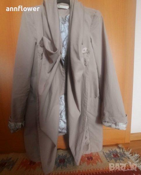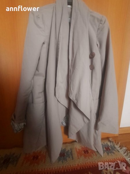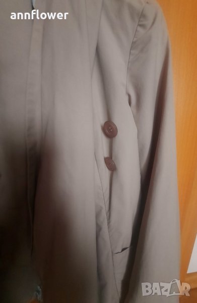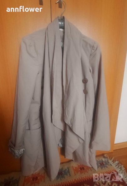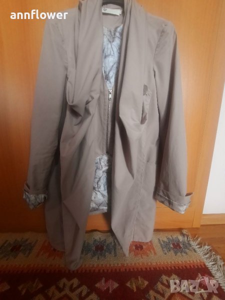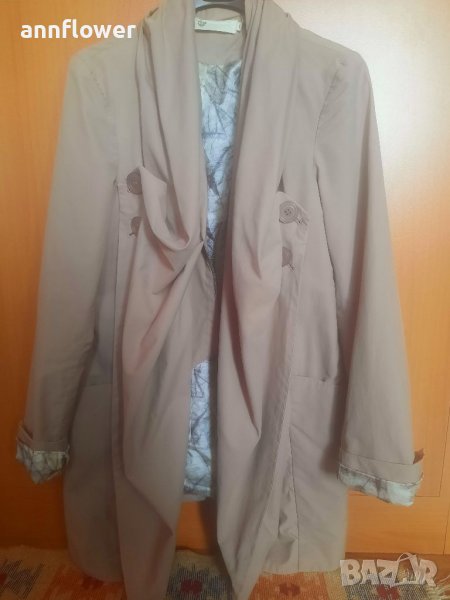 Манто като ново. Цвят бежов. Материя 66% памук 34% nilon. Размер S. Дължина отпред 84см, отзад 73см. Ширина на рамената 40см, ширина в мишниците 44см. Дължина на ръкава от рамото 63см.