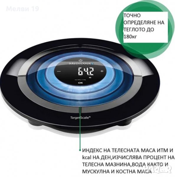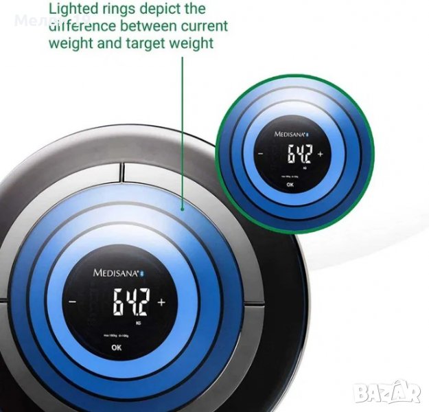 Оптималният спътник за вашето управление на теглото е скалата за анализ на тялото TargetScale 3 на Medisana. В допълнение към точното установяване на личното тегло, скалата за анализ на тялото изчислява и индекса на телесна маса (ИТМ), килокалориите на ден, дела на телесните мазнини, водата и мускулите, както и костната маса. Допълнителният режим на атлет отчита степента на активност и съответната консумация на калории за спортисти. Специална характеристика е иновативната целева функция, която показва текущата разлика спрямо целевото тегло на дисплея и я визуализира с помощта на три осветени пръстена на везната.