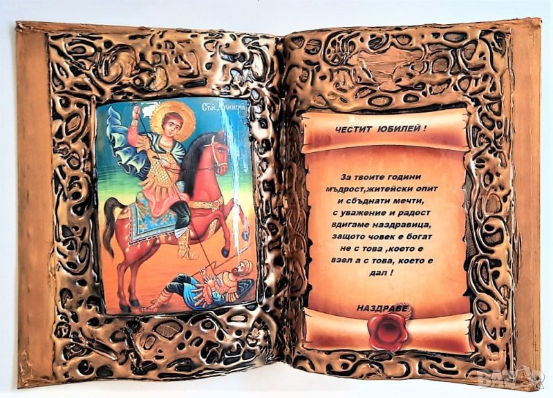 от авторска книга - икона със Св. Димитър с юбилейна бутилка, апликирана с кожа и оригинално пожелание за юбилей - 50, 60, 70 или 80 години.