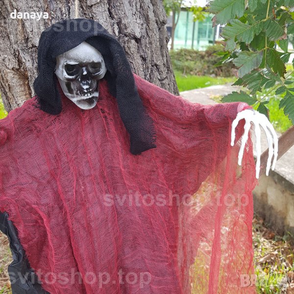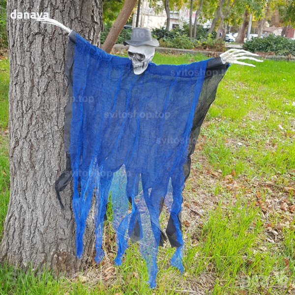 Страшна Halloween декорация череп с дрехи и шапка. Когато се закачи изглежда наистина страховито! Ръцете са метални и могат да се огъват според това каква стойка искаш да заеме. Предлагат се в различни цветове на дрехите.