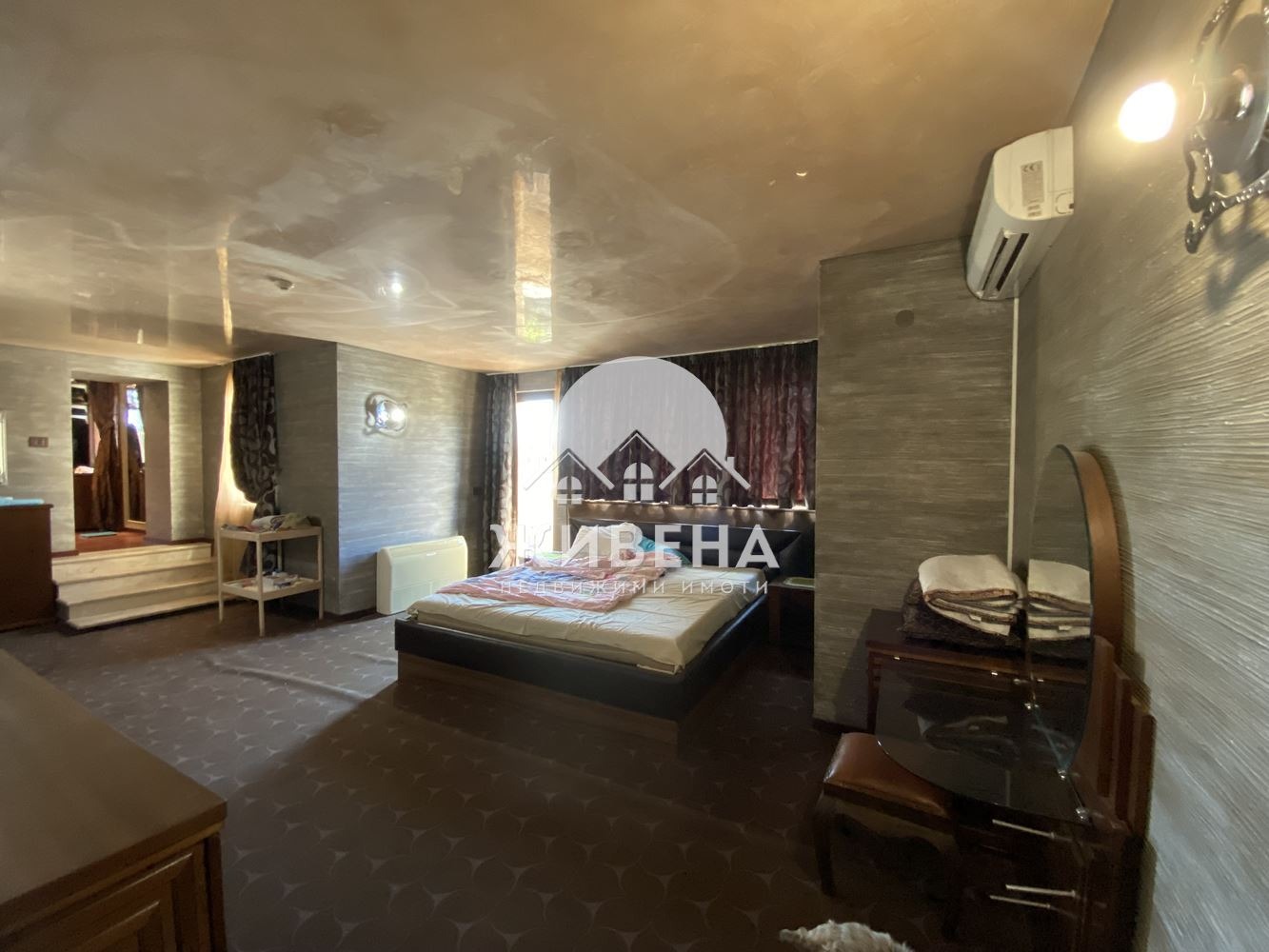 Подовите настилки са от родезийски тик, италиански мрамор, гранитогрес. Има положена външна и вътрешна изолация. Дограмата е немска пет-камерна PVC, с 3-слоен стъклопакет на марката Salamander. Изградена е VRV система за отопление и охлаждане с въздухопроводи във всички помещения. Във всички стаи има също така монтирани климатици. На покрива на къщата са инсталирани слънчеви колектори, затоплящи водата на голям бойлер, достатъчен за доставянето на топла вода към всички мивки. Продава се с наличното обзавеждане и оборудване. Топла вода се осигурява посредством бойлер със селективни соларни панели, захранващи цялата къща. Имотът е свързан към централния мръсен канал на града. Агенция Живена извършва необходимите проверки на имота, който сте избрали, организира всички етапи на сделката до нейното финализиране. Оказваме съдействие за отпускане на банков кредит. Оферта 5072