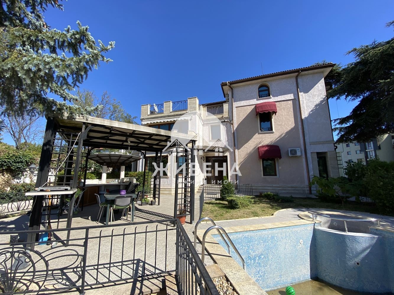 Агенция Живена предлага за продажба голям луксозен имот в района на к.к. Св. Св. Константин и Елена. Представлява къща с разгърната застроена площ от 753 кв.м, построена в аранжирано дворно място - с площ от 1129 кв.м. В двора има външен басейн, BBQ-зона, лятна кухня и 6 паркоместа. Всички етажи на този имот са завършени и обзаведени с високо-технологични материали, индивидуални дизайнерски решения и стилен интериор. Със своите 7 спални, 6 бани и 3 хола е подходящ за големи семейства, както и за техните гости. Разпределението е следното: