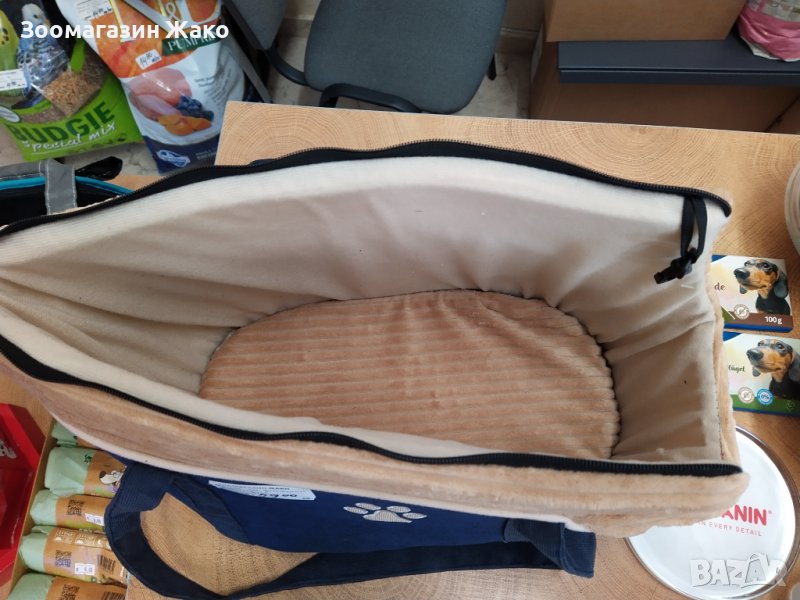 Малка-дължина 34 см, широчина -16 см, височина -20 см-с мека подложка,катарама за закопчаване на домашния любимец и външно джобче-цена 49 лв