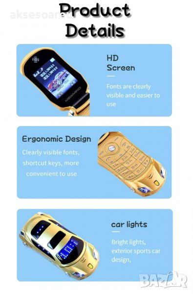 Мобилен телефон GSM с две сим карти Dual Sim отключен нов за ученици студенти с форма на автомобил ф