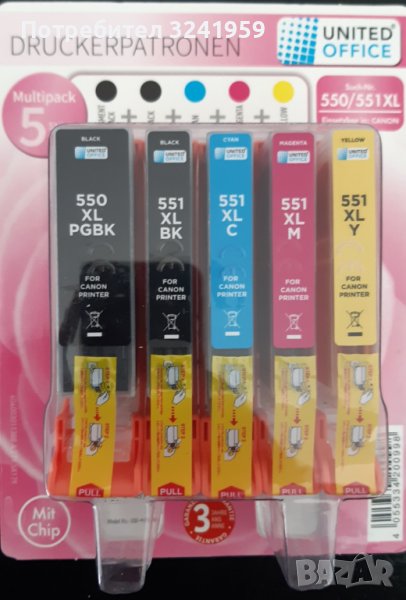 Комплект от 5 бр. касети за цветен принтер Canon 550 / 551 (2 бр. черни и по 1 бр. - синьозелен, пурпурен и жълт цвят).