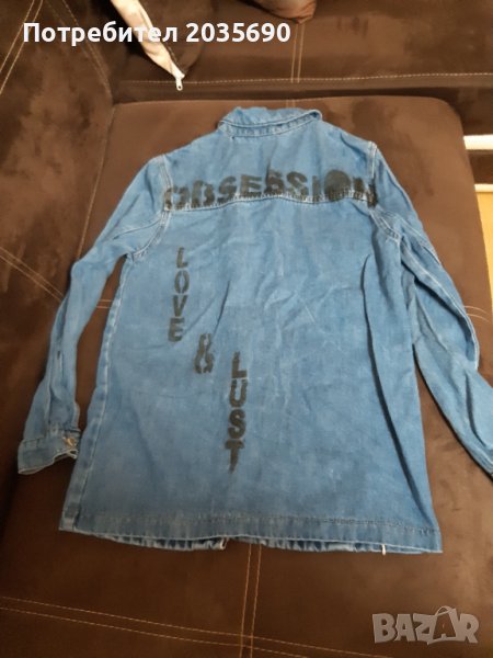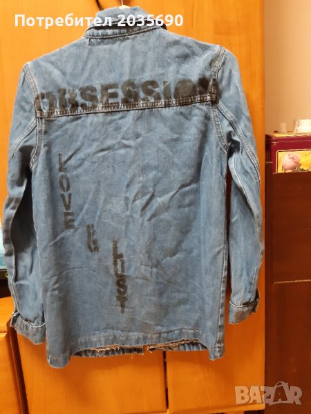 Дънково яке. Размери - дължина 65 см., гръдна/от мишница до мишница/ 43 см., дълж.на ръкава 59 см., ширина талия 46 см.едностранно. Отговаря на размер С/М