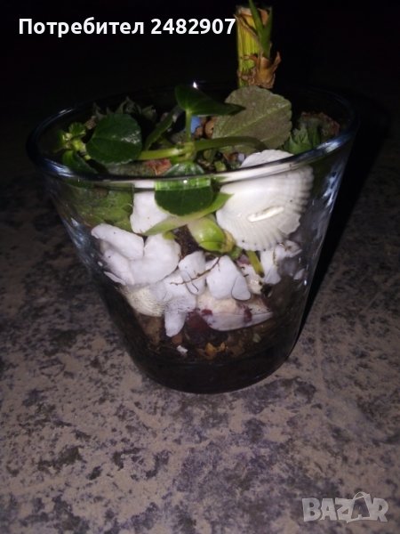 Аранжировка - сукуленти в стъкло. Подходяща, както за подарък, така и за украса на Вашия дом, офис, баня или кът за релакс. Не е необходимо поливане, достатъчно е 1-2 пъти месечно умерено пръскане с вода. Топло и студоустойчиви. Височина - около 12 см, диаметър в долната част - 7 см, диаметър в горната част - 9 см.