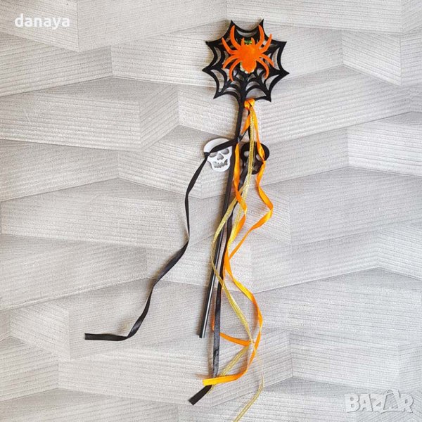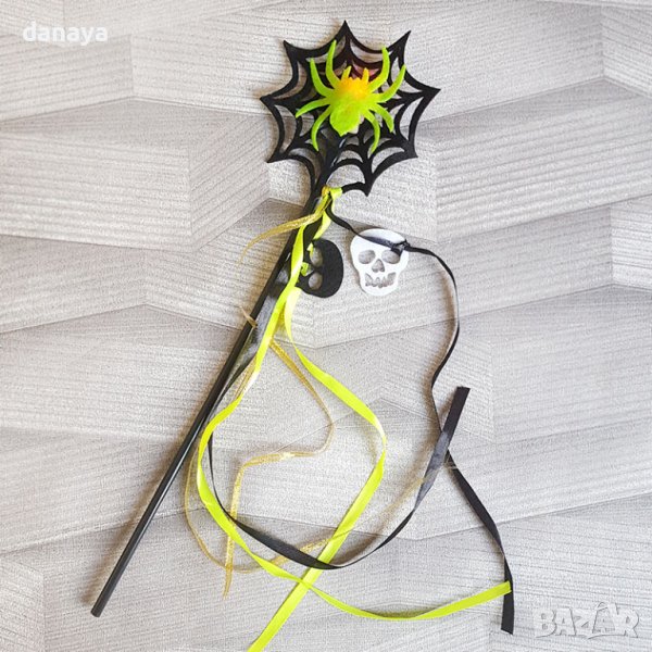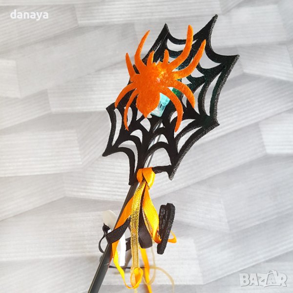 Хелоуин пръчка паяжина с паяк, който свети. Пръчицата е декорирана с пъстри ленти с прикрепени черепи по тях. Чудесен аксесоар към костюма за Halloween. Предлагат се в различни цветове на паяка.