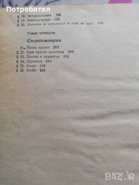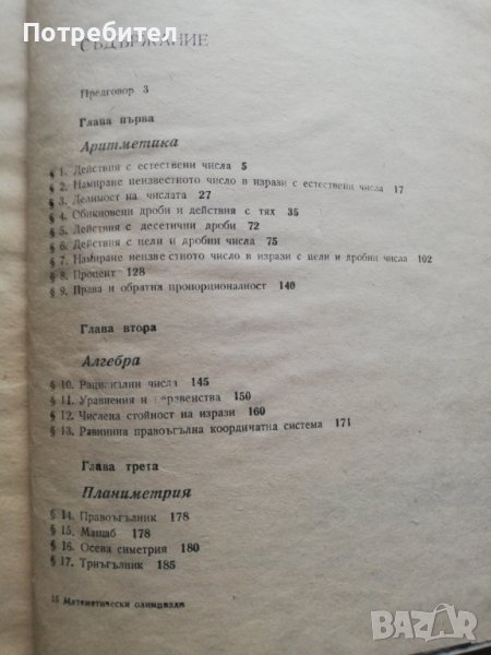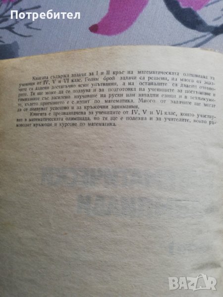 Математически олимпиади – първа част; твърди корици. Книгата е в много добро състояние. Съдържа задачи от първи и втори кръг на математически олимпиади за ученици от четвърти до шести клас. Разгледани са задачи от аритметика, алгебра, планиметрия и стереометрия. Голяма част от задачите са решени, на много от