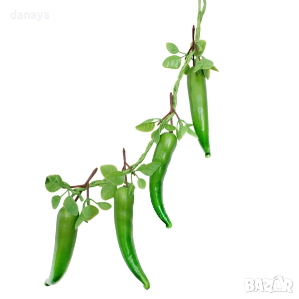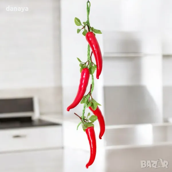 Реалистични червени чушки или зелени чушки със зелени листенца на връзка. Изкуствените зеленчуци са прекрасен декор и украса в битов кът, кухня, декориране на заведения, магазини и всякакъв тип помещения.