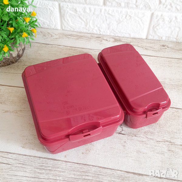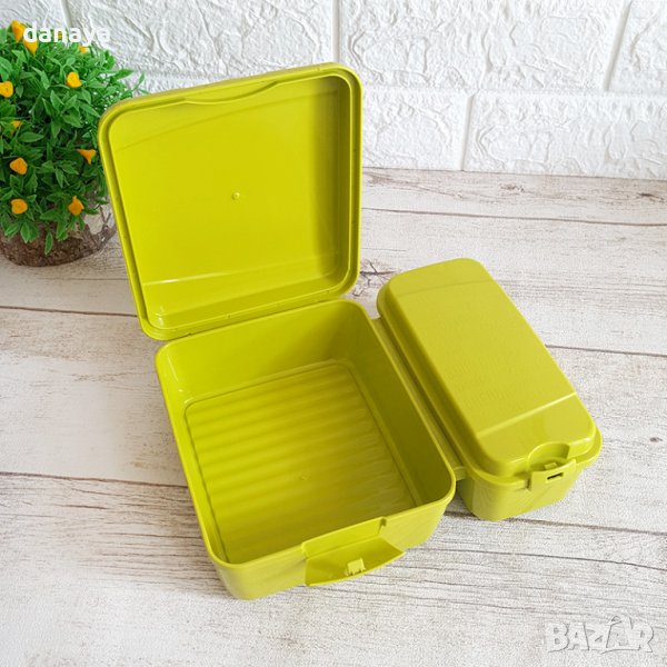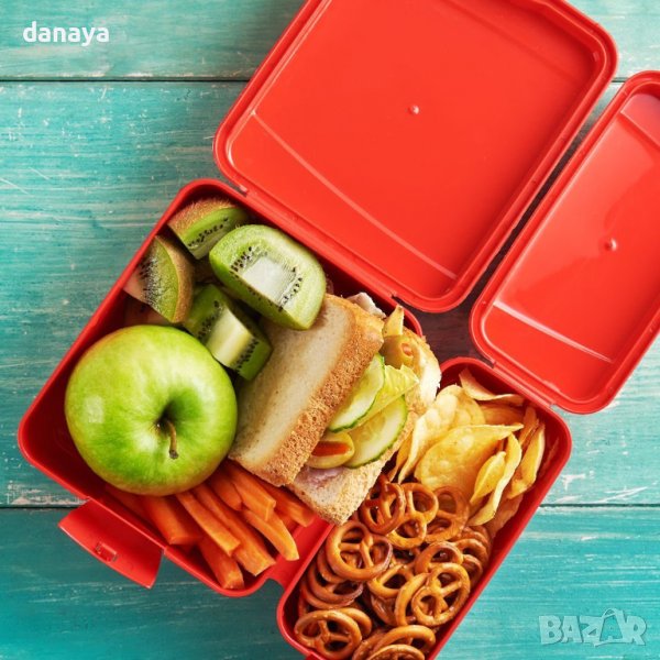 Пластмасова двойна кутия за храна. Кутията има две отделения. Едно основно, което е с вместимост 750 мл. В него може да побереш сандвич или друго сухо ястие. Второто отделение е с вместимост 400 мл, което е предназначено за зеленчуци, плодчета или десерт към обяда. Двете отделения си имат отделни капаци, които се отварят самостоятелно един от друг. Това е голямо предимство пред другите кутии за храна, защото вкусовете и ароматите на храните няма да се смесят.