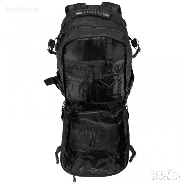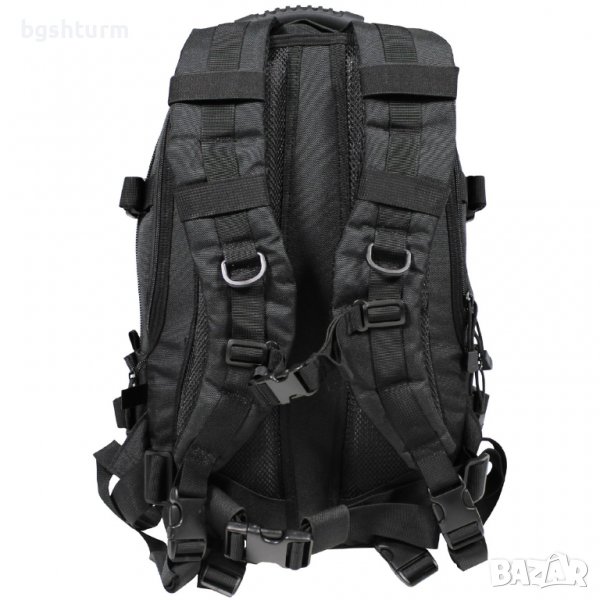 Раница, "Aktion", черна . Регулируеми, подплатени презрамки. Регулируеми презрамки на гърдите и талията. Подплатена задна част с двупосочен джоб с цип с подплатено плъзгащо се отделение и горна част. Отвор за тръба за пиене. Допълнителна малка каишка с капса отгоре. 1 горна дръжка за ръчно носене с 2 странични D-пръстена. 1 голямо основно отделение с двупосочен цип, 1 мрежест джоб с цип и 1 плъзгащо се отделение допълнителна малка каишка с капса отгоре .Малък отвор на дъното за оттичане на водата. 1 малко основно отделение с 1 карабинер и различни джобове, плъзгащи се модули и държачи за химикалки .2 малки странични джоба с кукички, регулируеми с цип. 1 компресионна лента на всеки страничен джоб отпред с малък джоб с цип, различни странични примки и панел примки ок. 10 х 5 см. Капацитет: ОК. 30 л Размери: ок. 30 x 47 x 20 cm (Ш x В x Д) Тегло: ок. 1,5 кг Материал: 100 % полиестер 900 D