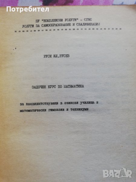 Задочен курс по математика за кандидатстващи в математически и езикови гимназии - Руси Русев– меки корици; в много добро състояние. Повечето от задачите са решени или имат упътвания.