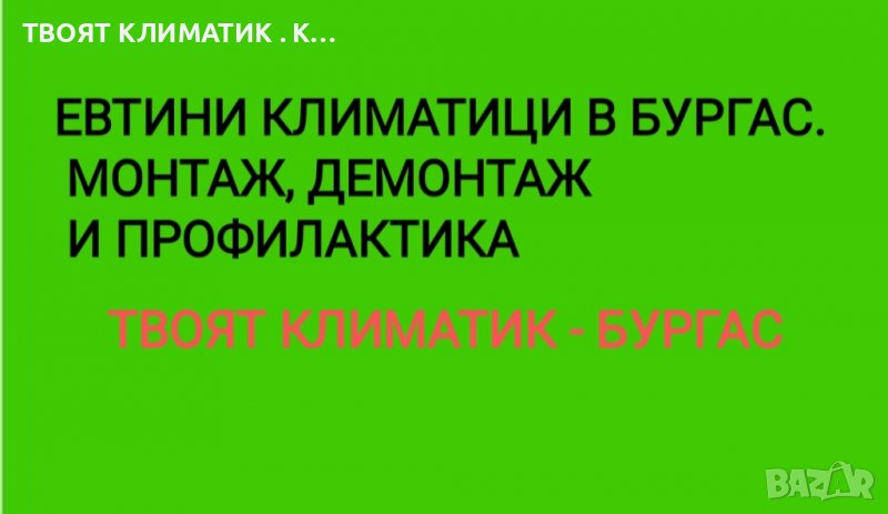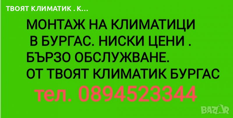 климатик и да не знаеш какъв да вземеш. Няма нужда вече да си губиш времето. Ние ще дойдем там където желаете. Ще ви донесем каталози и с професионална помощ ще изберете климатика от който имате нужда. ТВОЯТ КЛИМАТИК е фирма в Бургас занимаваща се с продажба и монтаж на климатици. За ваше удобство работим и в събота и неделя. Извършваме всякакви услуги за обслужване на климатика ви , за да работи безотказно. За повече информация и поръчки моля свържете се с нас на посочения телефон номер