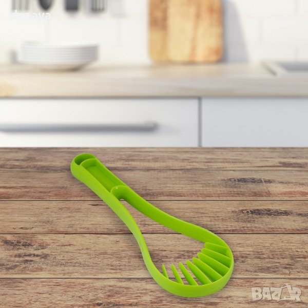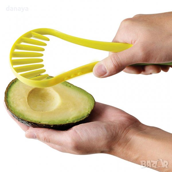 Кухненски уред за рязане на авокадо. С него лесно ще може да премахнете кората и едновременно с това да нарежете авокадото на еднакви парченца. Идеален е за украса и декорация на салати и ястия.