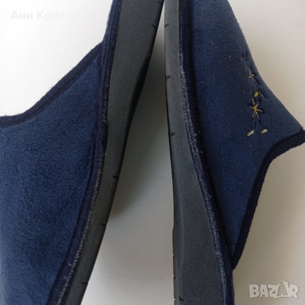 Нови, българско производство пантофи,на изолирано ортопедична височина 3,5см. и под пръсти 1,5см ходило. Материал текстил и отвътре вълна. Тъмно син цвят с бродерия цвете. Дължина 25 до 25,5см стелка. Леки и топли.