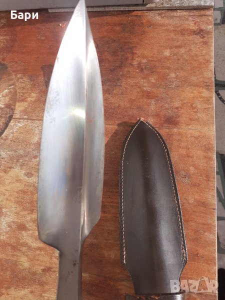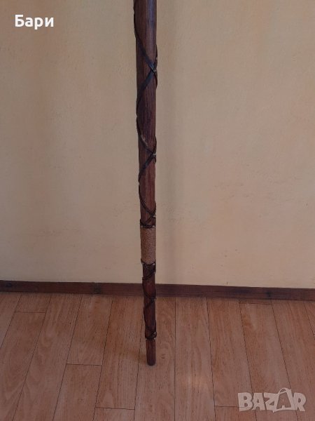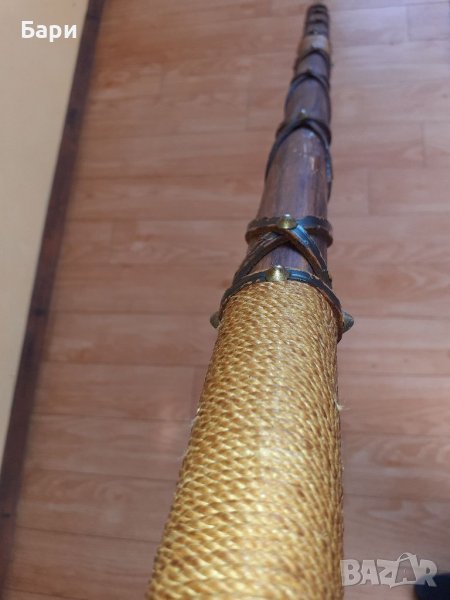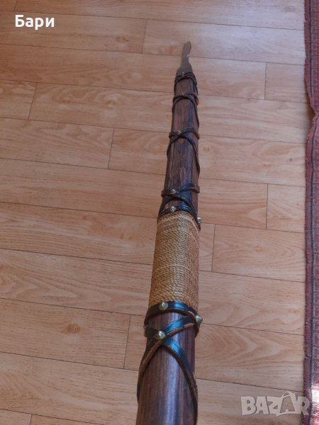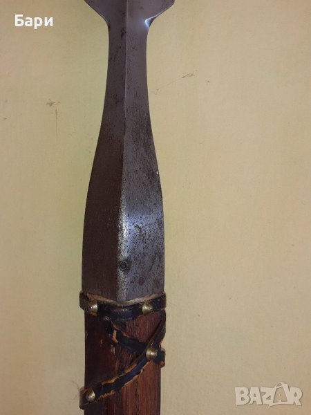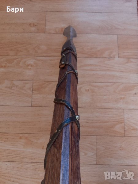То има масивна дървена дръжка покрита с кожени каишки, стоманен връх и кожен калъф.Има леки следи от употреба и износване.