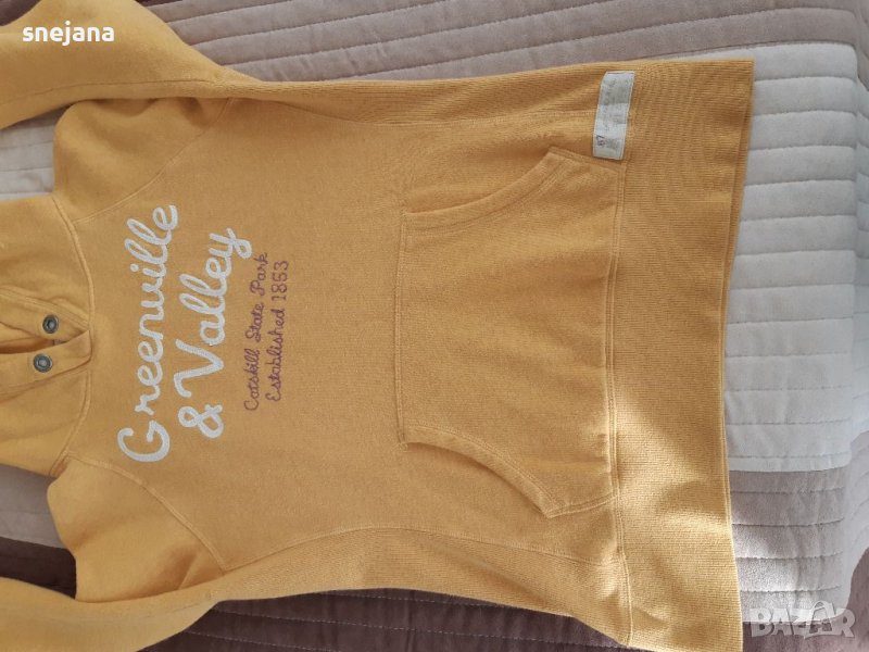 Суичара е в много добро състояние, без забележки, цвят горчица, размери от мишница до мишница 50см. Дължина 61см. Ръкав от под мишница до края 50см. Плътен,дебел подходящ за зимата.