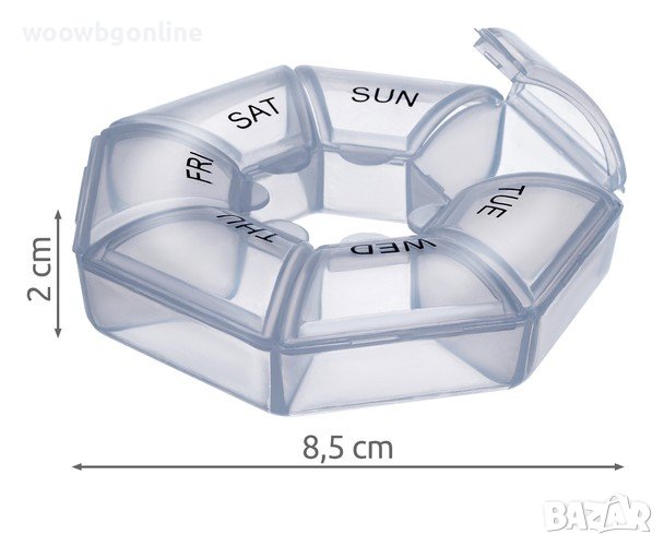 Контейнера има 7 отделения, които дават възможност за седмично разделение на лекарствата.