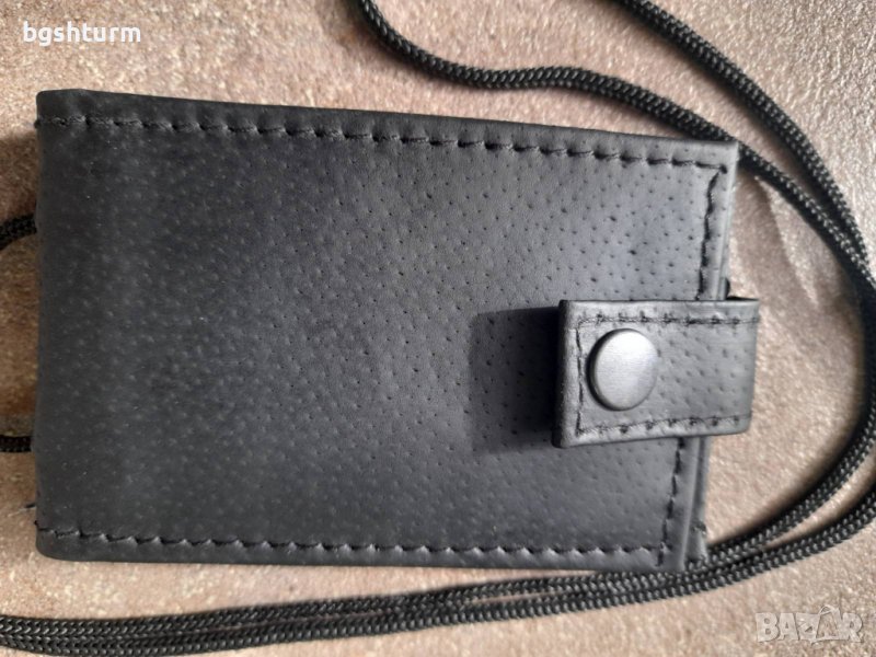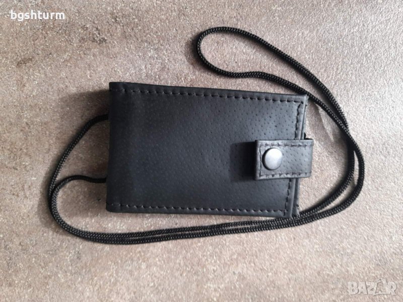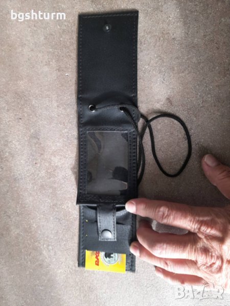 Калъф за документи и полицейска значка , черен , изработен от естествена кожа , със шнур за носене на врата , закопчаване с метална капса , тристепенно отваряне и затваряне , с 1 отделение за визитки , 3 отделения за документи и 1 отделение за полицейска значка .Размер в затворено състояние - 11х7см , в отворени 3 степени - 30х7см