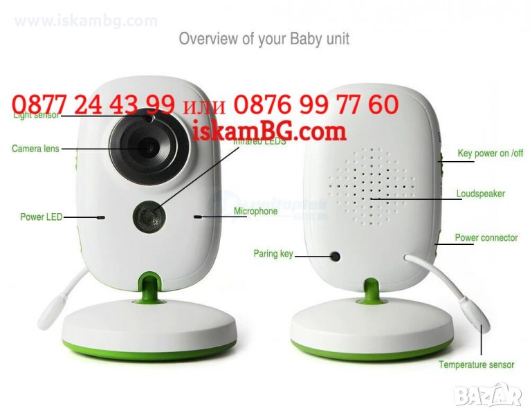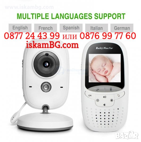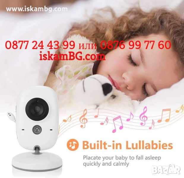 Видео бебефона е всичко което ви трябва за безпроблемното наблюдение на вашето дете по всяко време, през деня и през нощта. Възможност за дистанционна работа до 200м., презареждащи се батерии на цветния екран, издържащ до 8 часа без зареждане. Двупосочна аудио връзка, измерване на температура на стаята, нощен режим и други. Идеално за къщи, вили, апартаменти и др. Вграден музикален плеар, с който може да пускате приспивни песни на детето. Най-изгодното предложение на пазара е при нас! 24м. Гаранция!