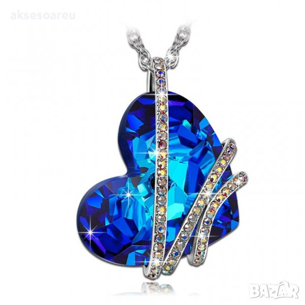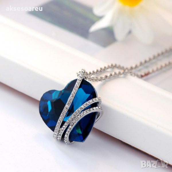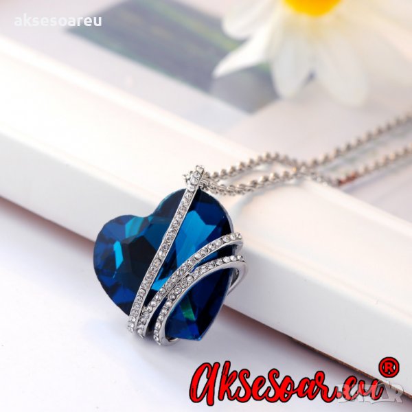 Дамско колие с висулка романтично чаровно синьо сърце кристал с посребрена верижка бижу верига мода