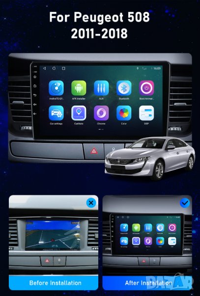 Мултимедия за PEUGEOT 508 Двоен дин Навигация, 2 Дин радио плеър 9“ дисплей, Android, Пежо 508 екран
