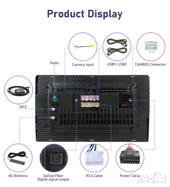 Пълен комплект с цялата рамка, преходни кабели и букси, декодери, предназначени и съвместими за монтиране на конкретния модел автомобил.