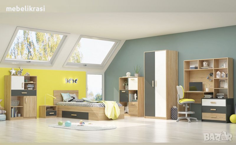 Модулно детско обзавеждане "Сидни" притежава всичко необходимо за обзавеждането на детска/юношеска стая. То включва: единично легло с включени еднолицев матрак Даная и чекмедже; нощно шкафче с чекмедже и ниша; шкаф с две вратички, чекмедже и ниши; етажерка с три вратички и ниши; двукрилен гардероб с удобно вътрешно разпределение - лост за закачалки и множество рафтове; бюро с надстройка, чекмеджета и ниши за съхраняване на учебници, документи и вещи.