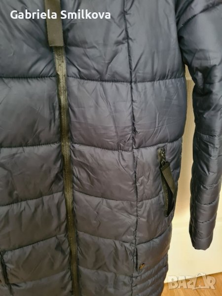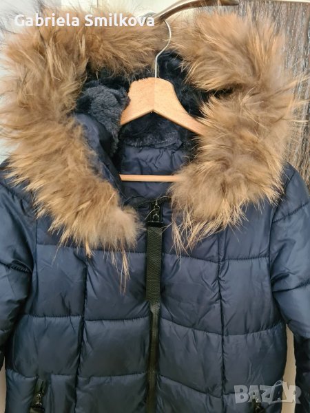 Цвят тъмно син, дължина над коляното. Размер S-M. Много топло, отвътре е с мека подплата. Косъма е на тик-так копчета, може да се сваля. Нормални следи от употреба. Купувано от магазин в Paradise за 250 лв.