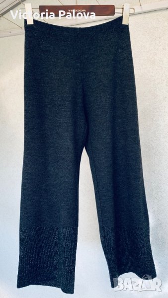 Модерен трикотажен панталон,50% вълна,50% акрил-държи форма,не образува”колене”.удобен и практичен,с ластик по талия(от 37 см до 50см).дължината от колана е 88см,отвътре-62см,широчината на крачола горе е 32см,долу-23см