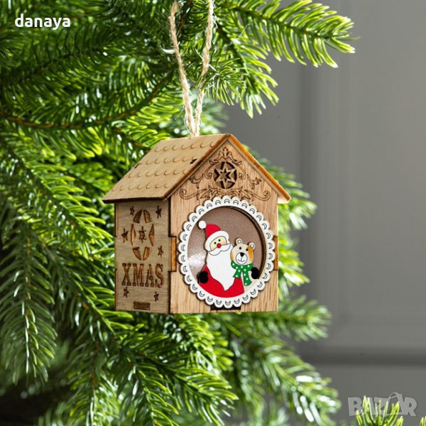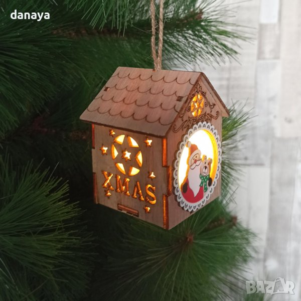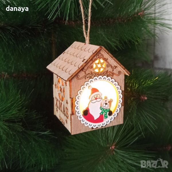 Украшение за коледна елха. Малка дървена коледна къщичка, която свети в много мека светлина. На покривчето си има връвка за закачане на коледната елха или на гирлянд, коледен кът. Изработена от дървен материал, с красива картина на прозорците си- Дядо Коледа и Мечо ще ви се усмихват, всеки път, когато я погледнеш. Работи с 3 батерии тип LR1130, които са включени в комплекта.
