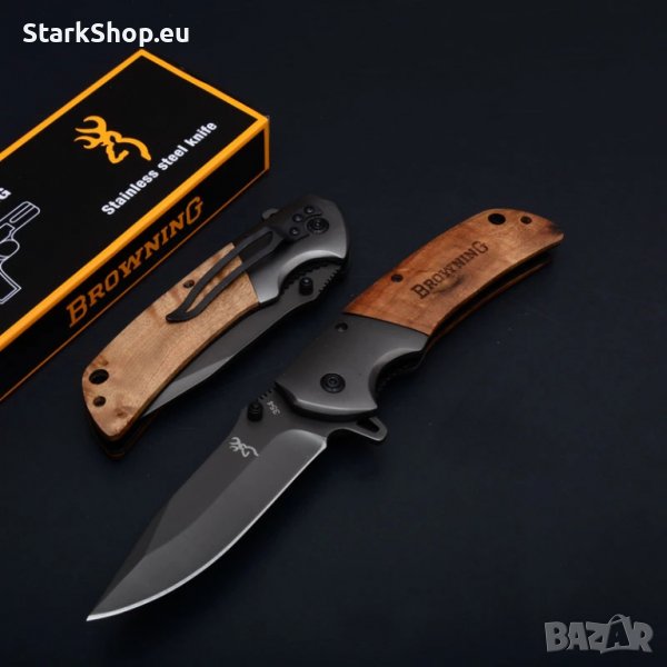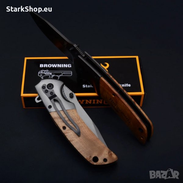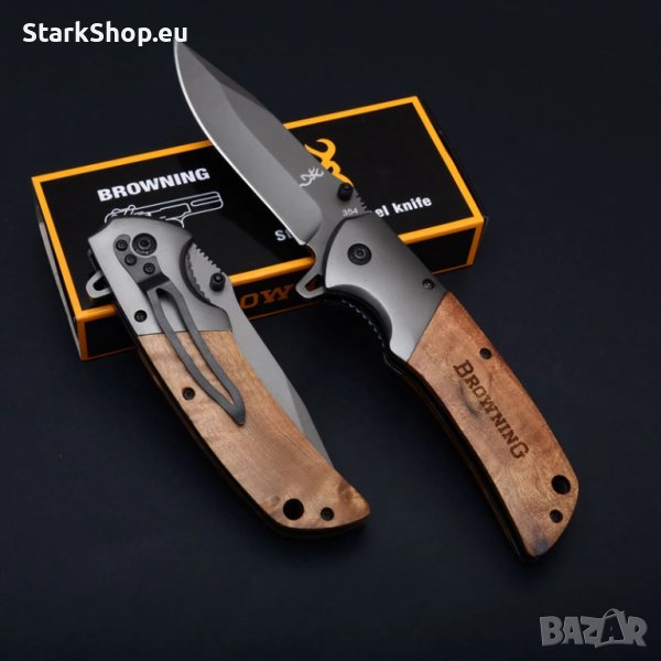 Уникален Испански сгъваем нож Browning 354 за самозащита, полуавтоматичен с линейно заключване. Изработен от неръждаема стомана 440C. Острието е с оксидирано титаниевосиво покритие, непозволяващо светлинни отблясъци. Дръжката е от дърво и стомана, с клипс за носене на колан.