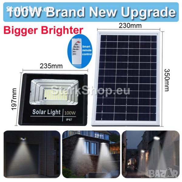 Изключително мощна соларна лампа 80W тип прожектор със отделен соларен панел и ярка LED светлина. Захранва се от слънчева и дневна светлина посредством фотоволтаичен панел. Той преобразува светлинната енергия в електрическа, зареждайки акумулаторна. Щом се стъмни, светлинен сензор активира светлината на лампата автоматично. Прожектора може да осветява в продължение до 8-12 часа в зависимост от режима.Соларния панел е отделен от лампата и се свързва към нея посредством 4.4 метров кабел.