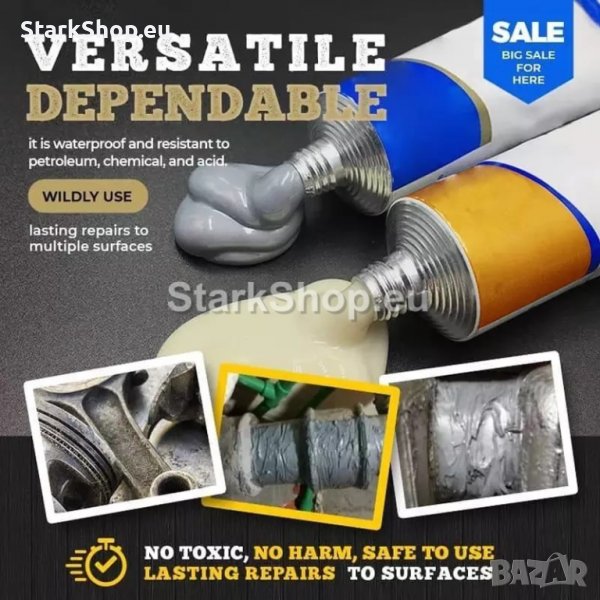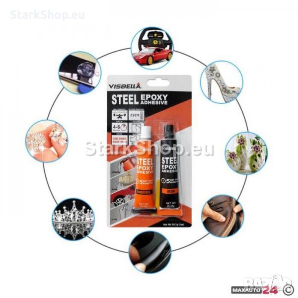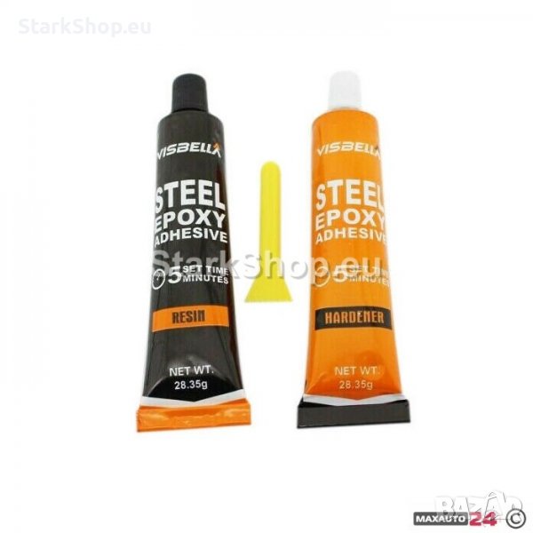 Visbella Steel Epoxy Adhesive е двукомпонентно лепило за бързи ремонти, познато още и като течен метал, състоящо се от епоксидна смола и втвърдител. Когато се смесят в равни обеми, смолата и втвърдителят реагират, за да създадат здрава, твърда връзка с висока якост за 4 минути. Предлага се в удобни за изстискване тубички, които се смесват в равни части. Може да се използва като лепило за широк спектър от материали или като универсален пълнител за запълване на празнини, повърхностни ремонти и ламиниране. Не се свива и е устойчив на вода и най-често срещаните разтворители. Може да се оцветява със земни пигменти, цимент или пясък за съответствие на цвета. Може да се шлифова и пробие.